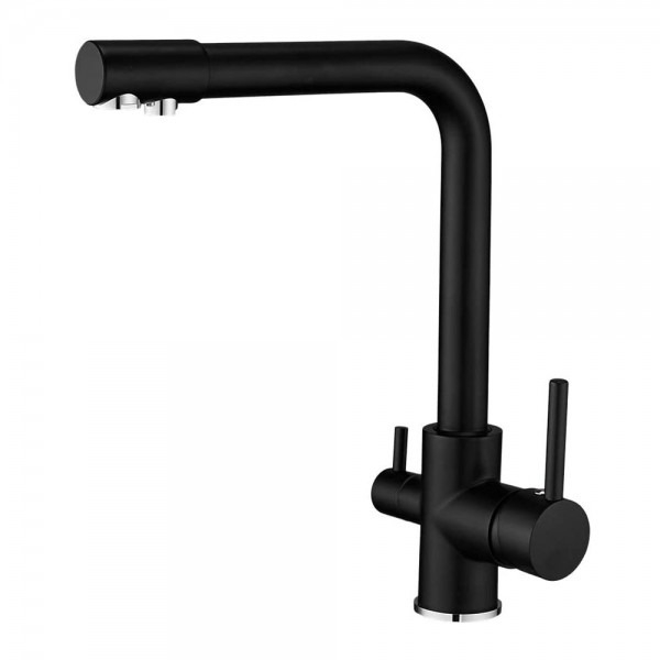 Aceasta este o baterie cu 3 cai, cu finisaj negru, care iti ofera posibilitatea de a consuma apa purificata pe o cale separata fata de apa nefiltrata. Acesta este un avantaj major deoarece apa filtrata va ajunge in paharul tau pe o cale complet sterila. Bateria are 2 robineti separati si de asemenea 2 cai de curgere a apei. Robinetul din stanga este folosit pentru apa filtrata iar cel din dreapta actioneaza apa calda si rece.