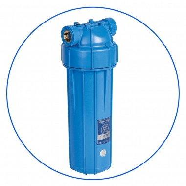 Corp (carcasă tubulară albastră de 10 inch), montat pe conducta de alimentare cu apă rece. Potrivit pentru inserții de 10" înălțime și 2 1/2" în diametru. Se montează de obicei sub chiuvetă sau pe priza principală de apă rece din apartament. Orificiul de ventilație vă permite să eliminați cu ușurință aerul acumulat în carcasă după înlocuirea cartuşelor.
