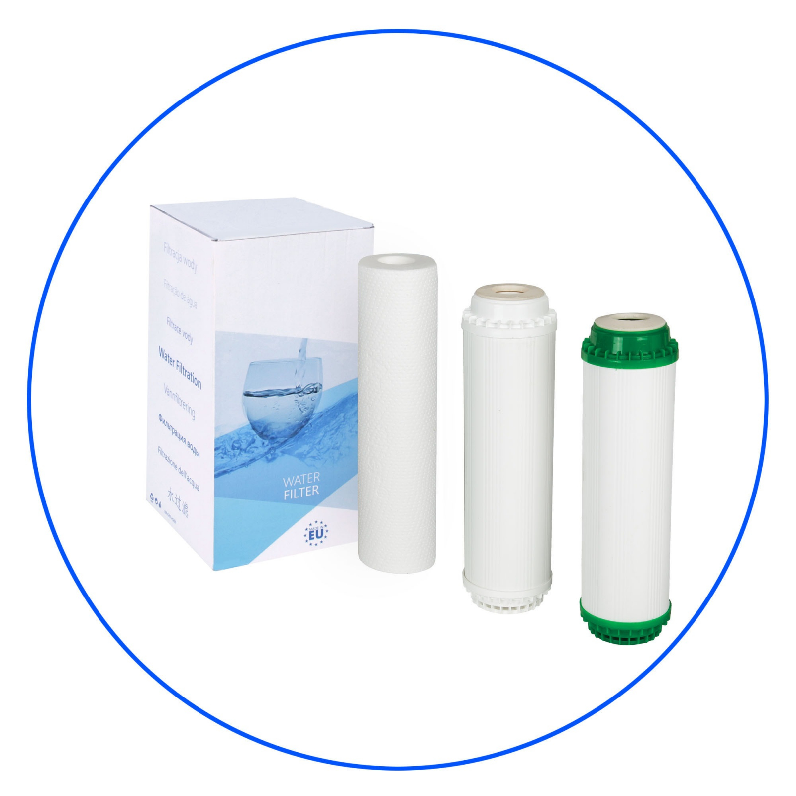 Un set de trei cartușe pentru  filtrul Aquafilter FP3-K1 , asigurând funcționarea fără probleme a filtrului și parametrii apei constanti și mari.