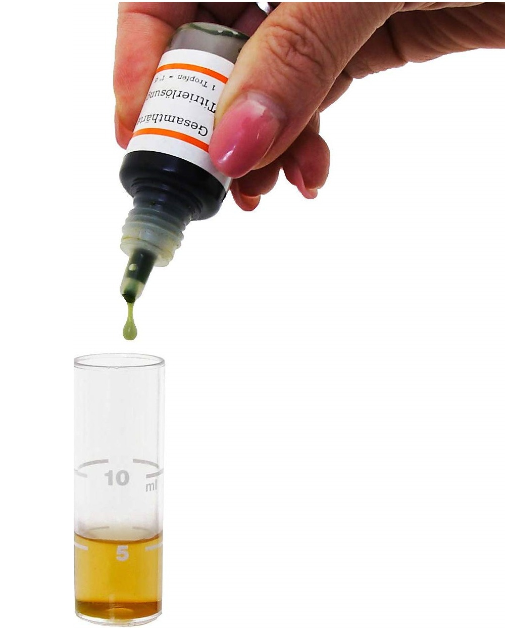 Duritatea este măsurată prin adăugarea unei picături de titrant la proba de apă de 5 ml. Daca apa este dura se va colora in rosu, continuati sa puneti picaturi pana in momentul in care apa devine verde. Numărul de picături până când culoarea apei se transformă de la roșu la verde conferă gradul de duritate exprimat in grade germane (principiul titrării).